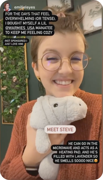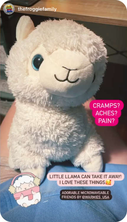 “I just got a Warmies llama and it is the BEST thing for my chronic pain and anxiety. I’m so happy with my purchase, I’m thinking about buying the frog wrap too!”